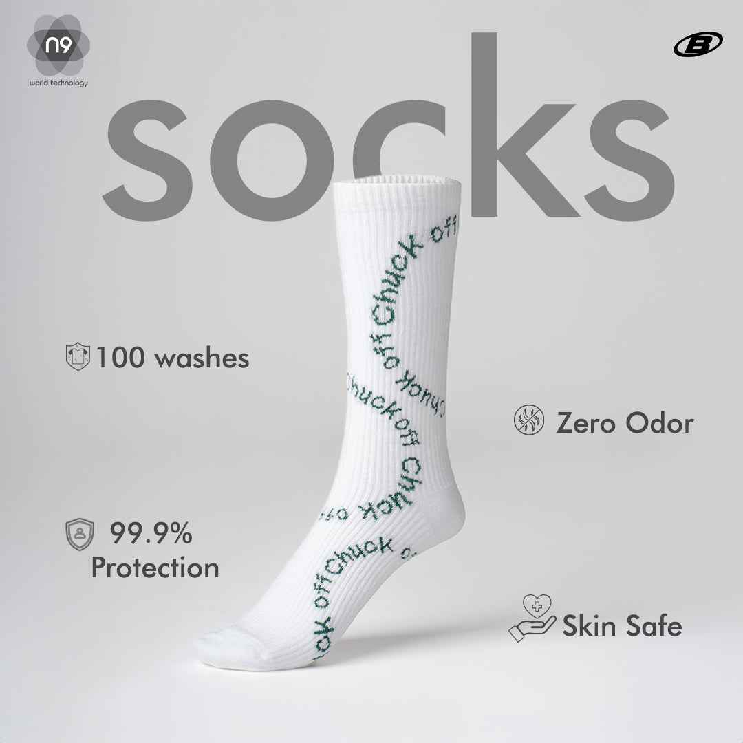 The Chuck Off Ankle Socks bring comfort, style, and advanced hygiene to everyday wear with a subtle edge. FeaturingN9 Pure Silver technology, these socks neutralize 99.9% of odor-causing bacteria, keeping feet fresh through extended wear while lasting 100+ washes. The white color keeps them versatile and clean, while the bold repeating "Chuck Off" text branding adds personality that stands out without overpowering any outfit. Crafted from 80 percent cotton, 18 percent polyamide, and 2 percent elastane, the fabric feels soft, breathable, and slightly stretchy, providing a secure fit that moves naturally with every step. The cotton ensures smooth comfort against the skin, while the polyamide and elastane maintain shape and durability, making the socks ideal for all-day wear. The crew lengths its perfectly with sneakers, trainers, or casual shoes, giving every look a polished yet effortless finish. Designed for anyone who values essentials that blend function and style, the Chuck Off Ankle Socks transform a basic accessory into a wardrobe staple with hygienically advanced protection and versatile street-ready appeal.