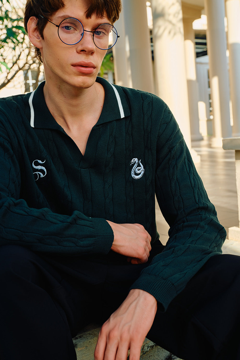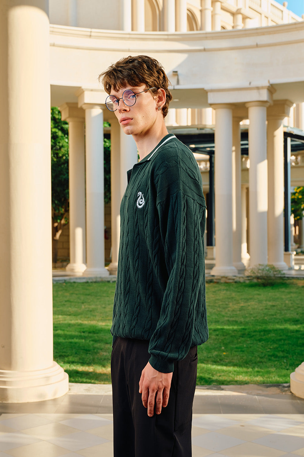 The Slytherin Cable Knit Polo brings refined house style into a modern wardrobe staple designed for everyday wear. Crafted from 100% cotton, the knit feels soft, breathable and premium while still holding a clean, structured silhouette. The olive green colour reflects subtle power and sharp taste, making the polo stylish without loud graphics. A polished collar and cable texture add depth, giving the piece an elevated finish suitable for casual or semi smart outfits. It pairs easily with denim, trousers or layered outerwear. Built for men who prefer understated wizarding references, this polo blends comfort, heritage and contemporary streetwear spirit. The result is a timeless essential that looks effortless but intentional every time you wear it, carrying quiet confidence and character while staying comfortable season after season. A piece made to last, wear, repeat and enjoy endlessly every single day.