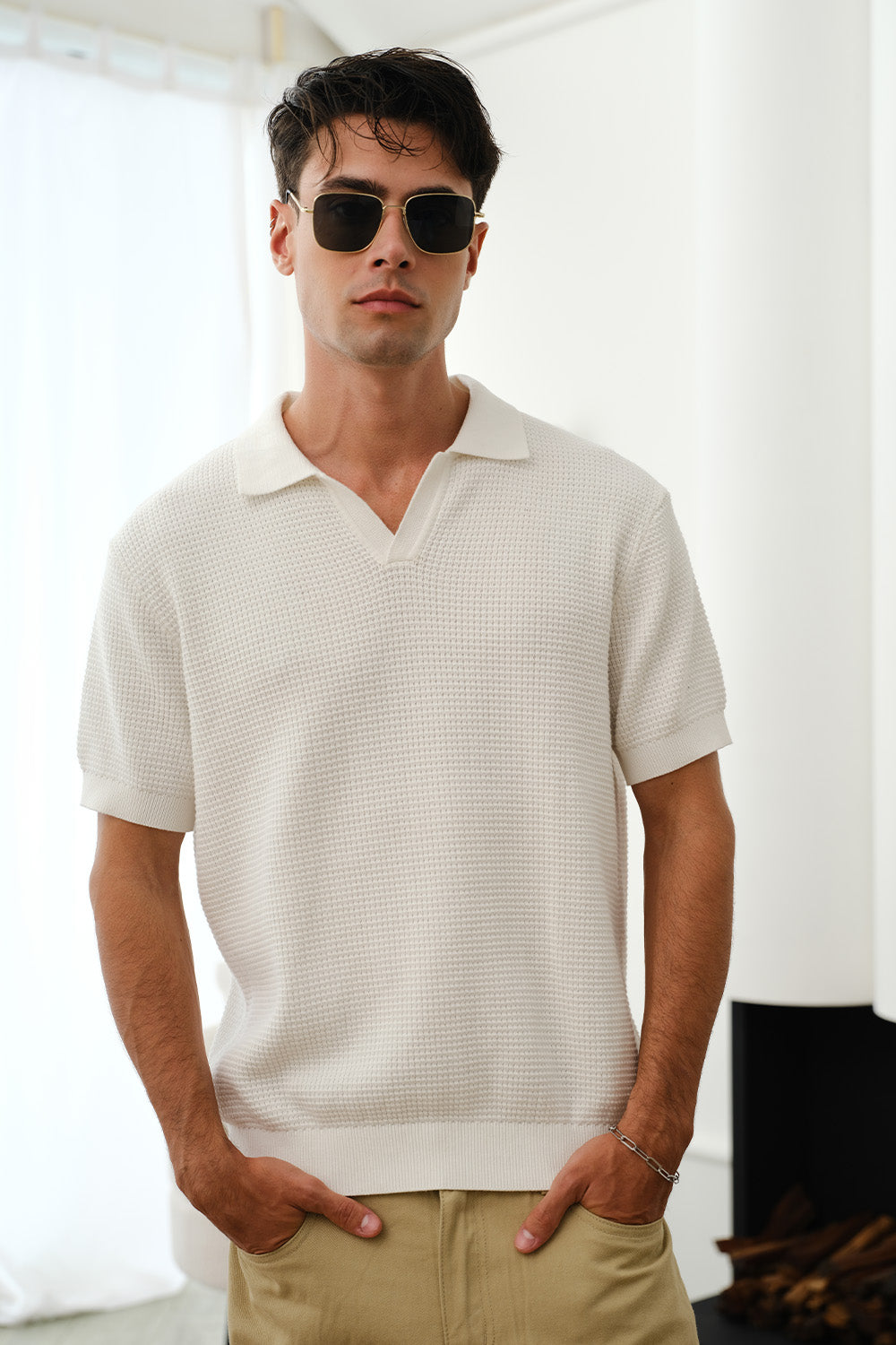 The Ivory Knit Polo T-shirt for men combines classic style with everyday comfort. In a sophisticated off-white shade, this polo is crafted from 100% cotton, offering a soft and breathable feel that’s ideal for any season. The knit texture and timeless polo collar add a refined touch, making it versatile enough for both casual and semi-formal occasions. Pair it with jeans, chinos, or shorts for an effortlessly polished look. Comfortable and stylish, the Ivory Knit Polo T-shirt is a must-have staple in any wardrobe.