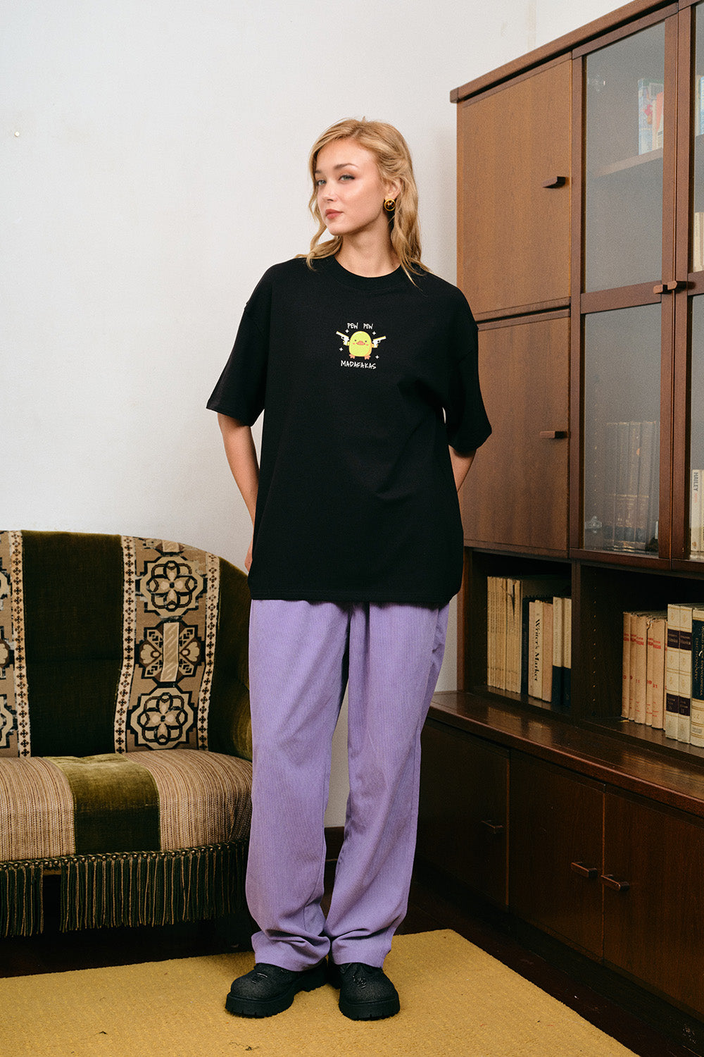 If your vibe is “cute but unhinged,” the Quack Attack Black Oversized T shirt fits you a little too well. Made from 95 % cotton and 5 % spandex, it feels soft, airy and has the right amount of stretch to keep the oversized fit relaxed through the day. The black base gives it a clean streetwear vibe, while the Quack Attack graphic brings full chaotic duck energy that makes people look twice. With a GSM of 230, the fabric drapes smoothly and holds shape without feeling heavy. Style it with denim skirts, cargos or wide-leg pants for a playful off-duty look. Perfect for women who like humour in their wardrobe, this tee combines comfort, personality and cartoon-level madness.